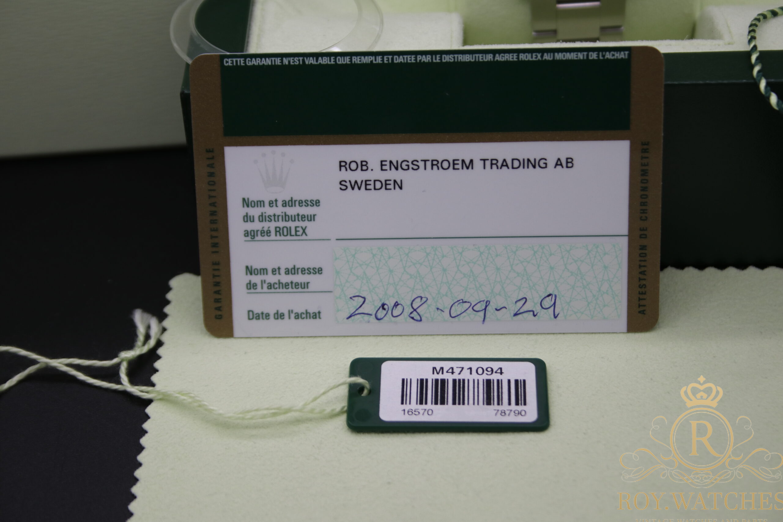Full set from 2008. LC 267 – Sweden Sold: 29.09.2008 Explorer booklet Oyster booklet Translation Booklet Chronometer hang tag Hang tag with serial number Bezel protection Rolex boxset |