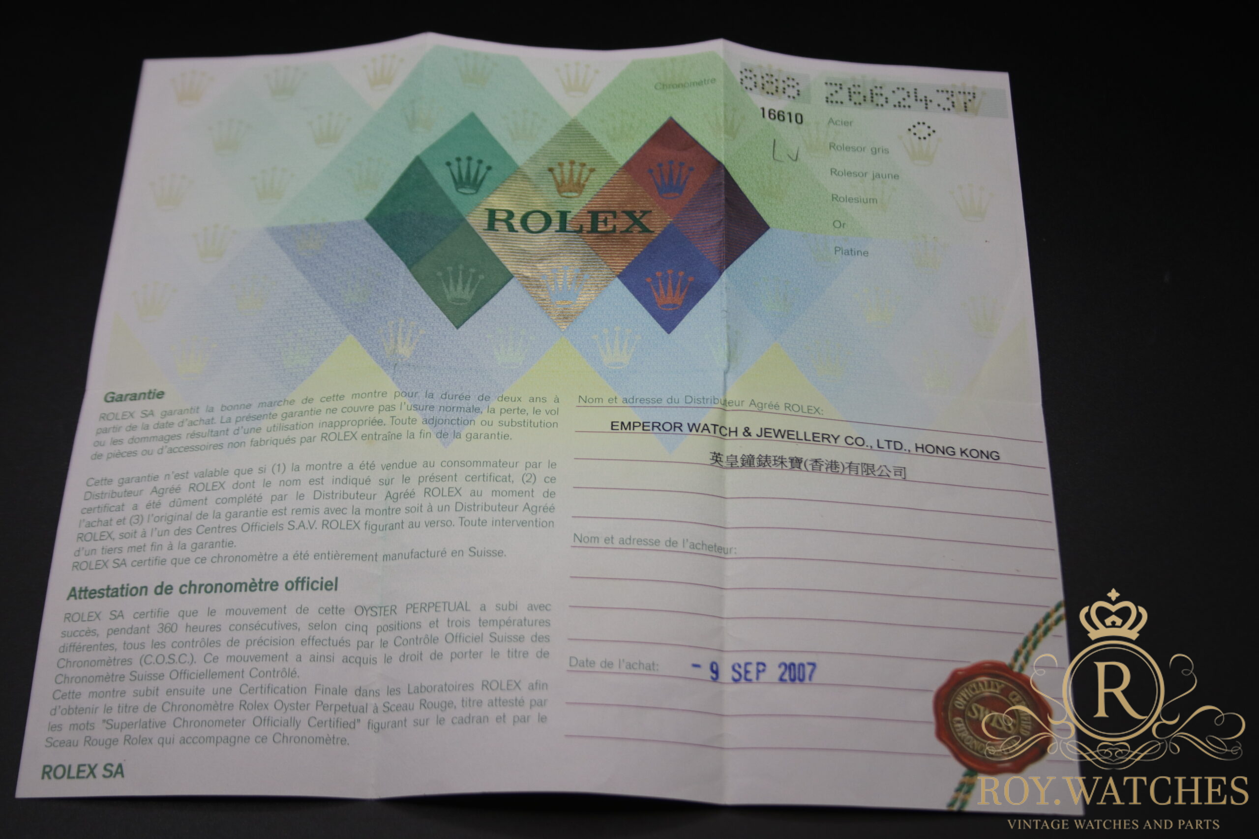 Full set from 2007. LC 888 – Hong Kong Sold: 09.09.2007 Submariner booklet Oyster booklet Translation booklet Rolex boxset |