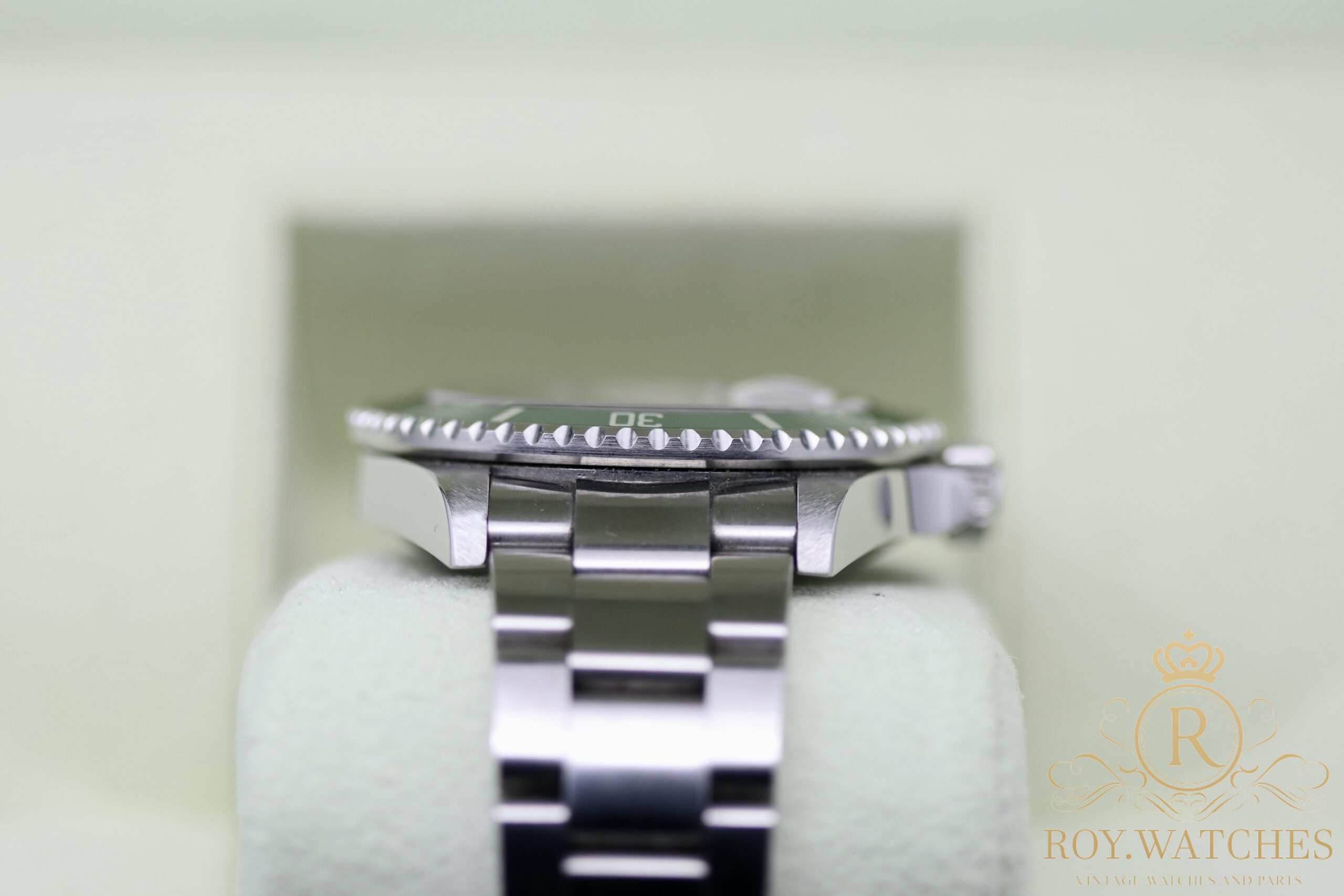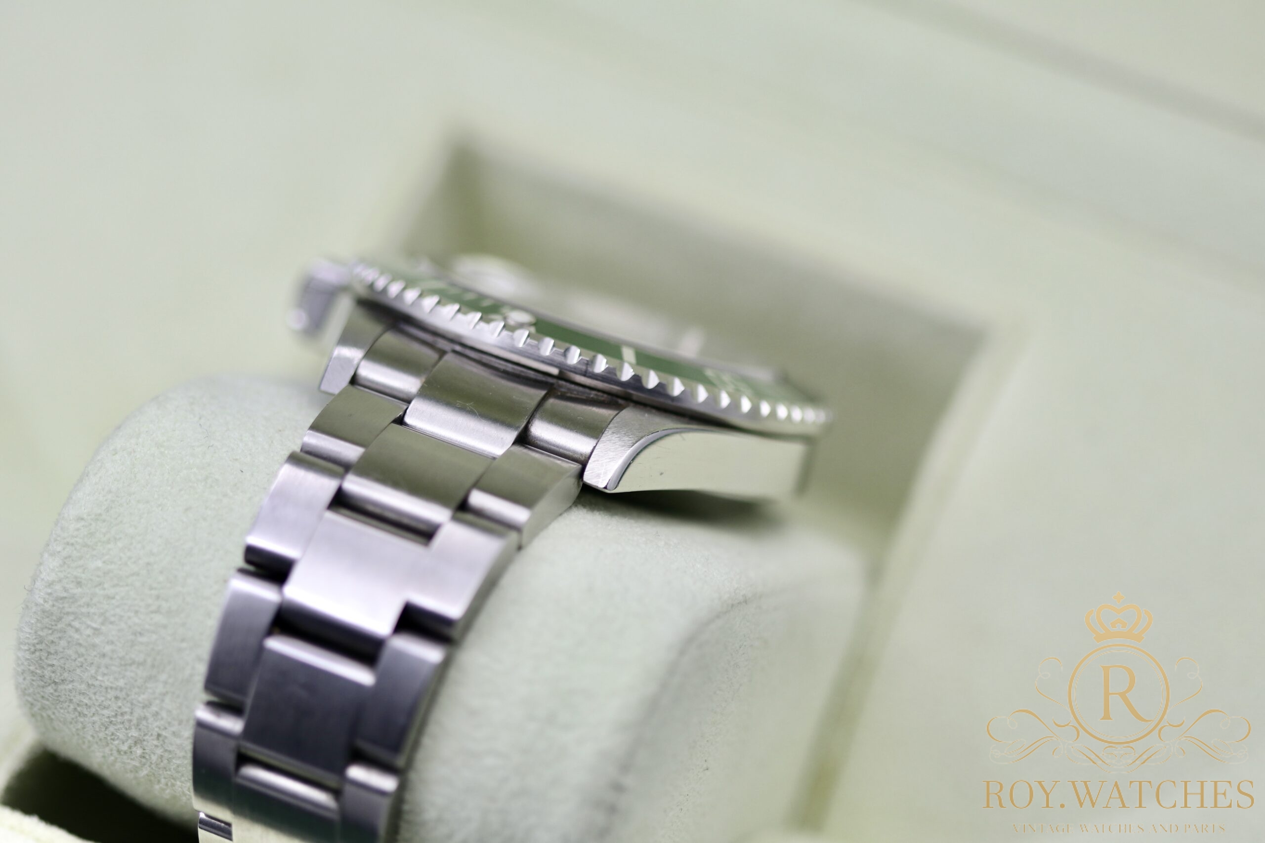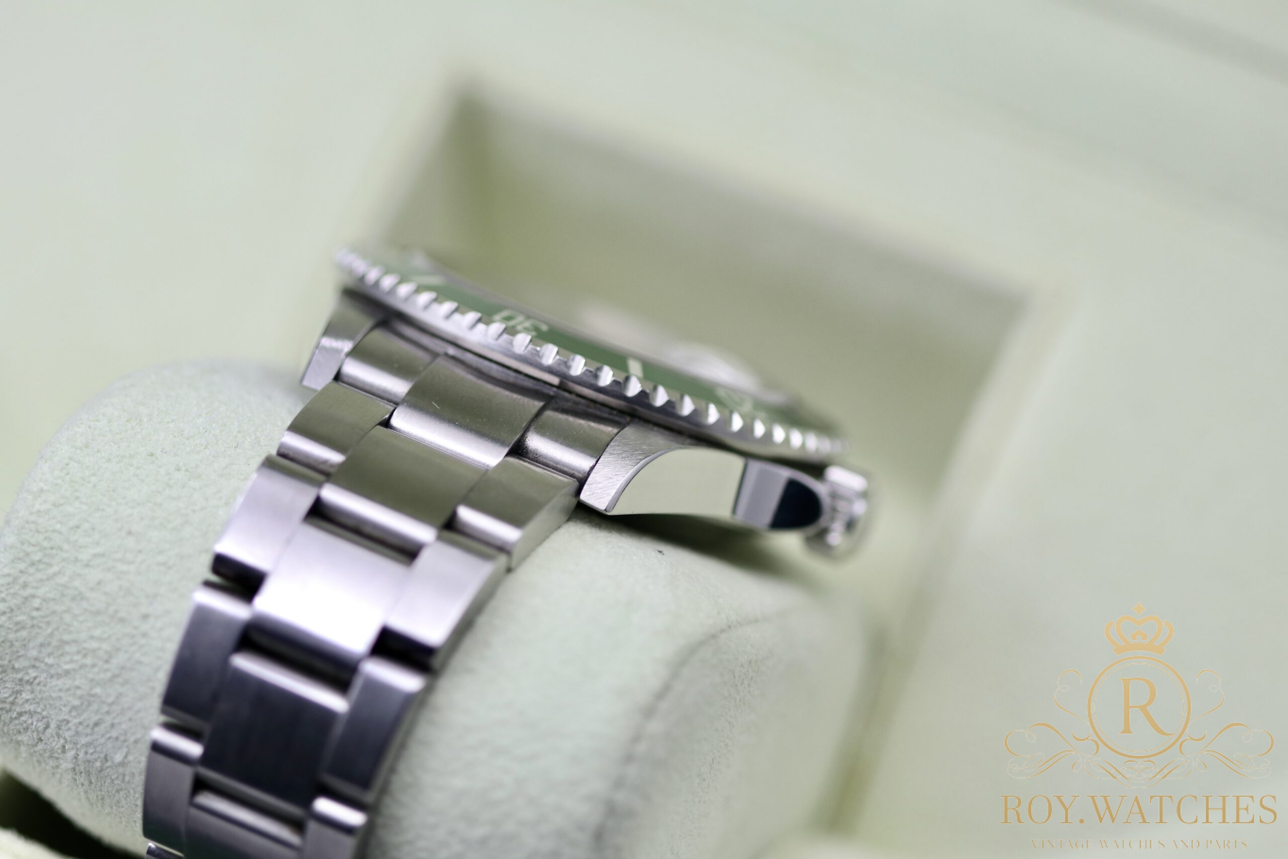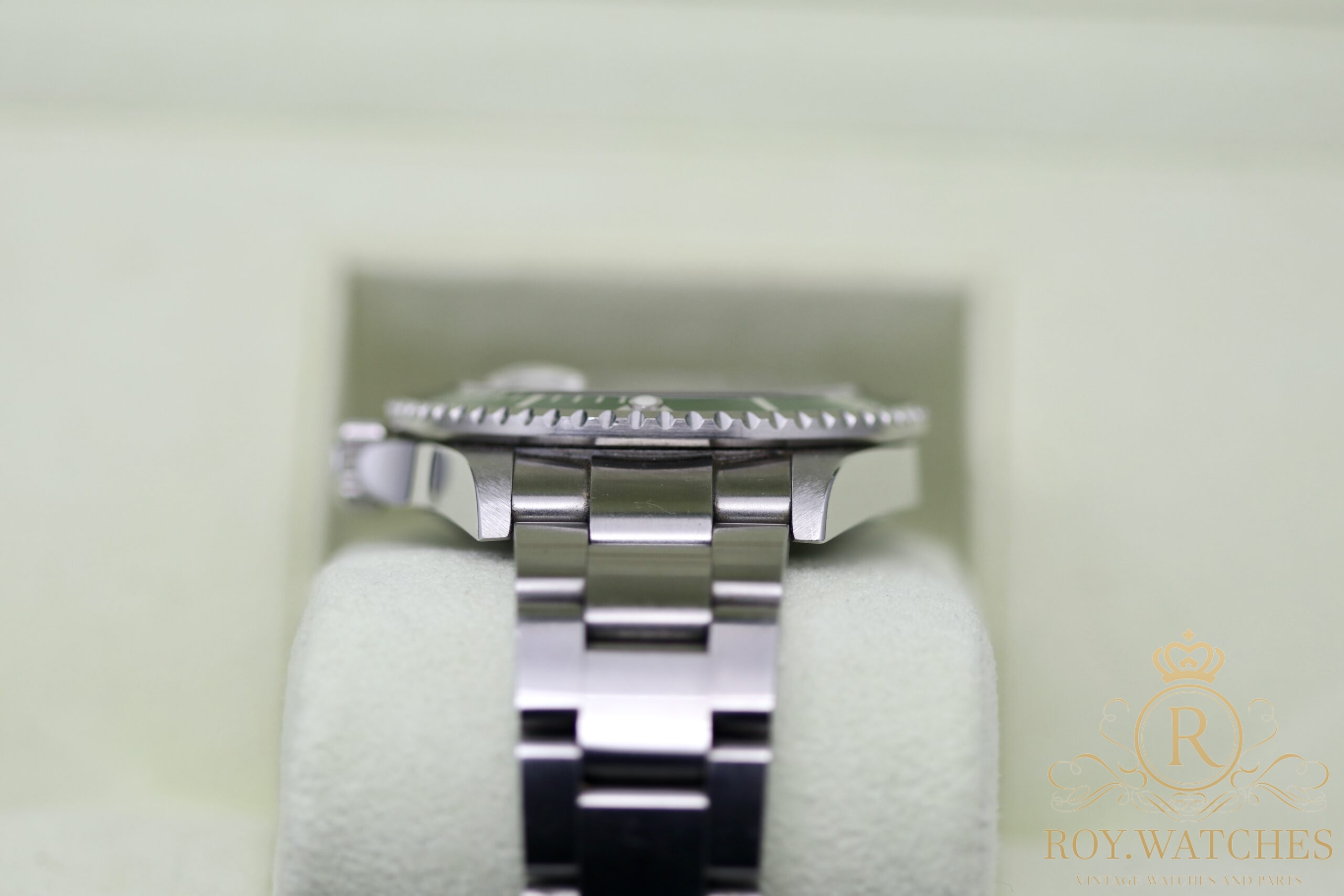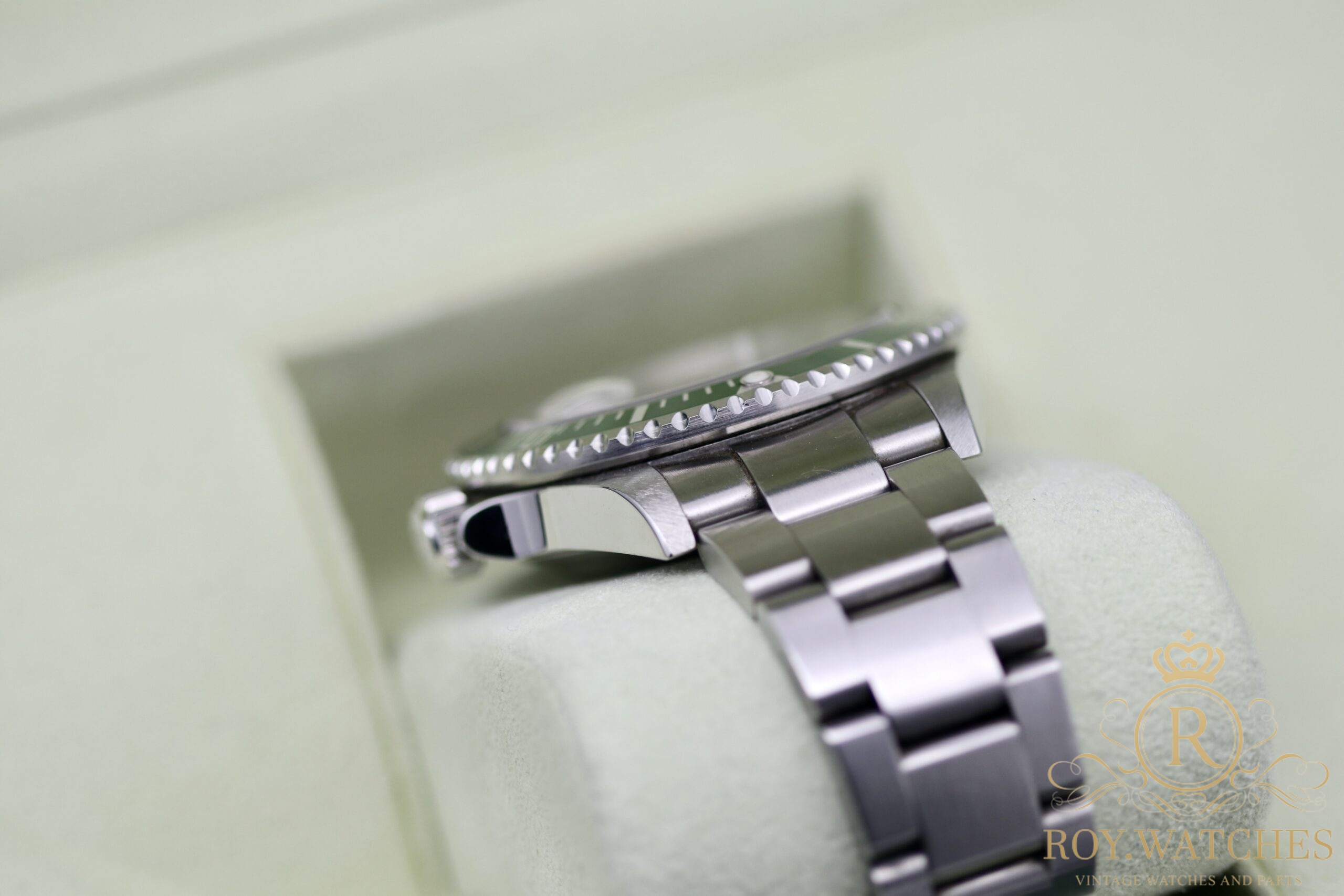 Perfect green Insert. First steel bracelet 93250 with 12 links. Clasp stamped EO 12 (2007).