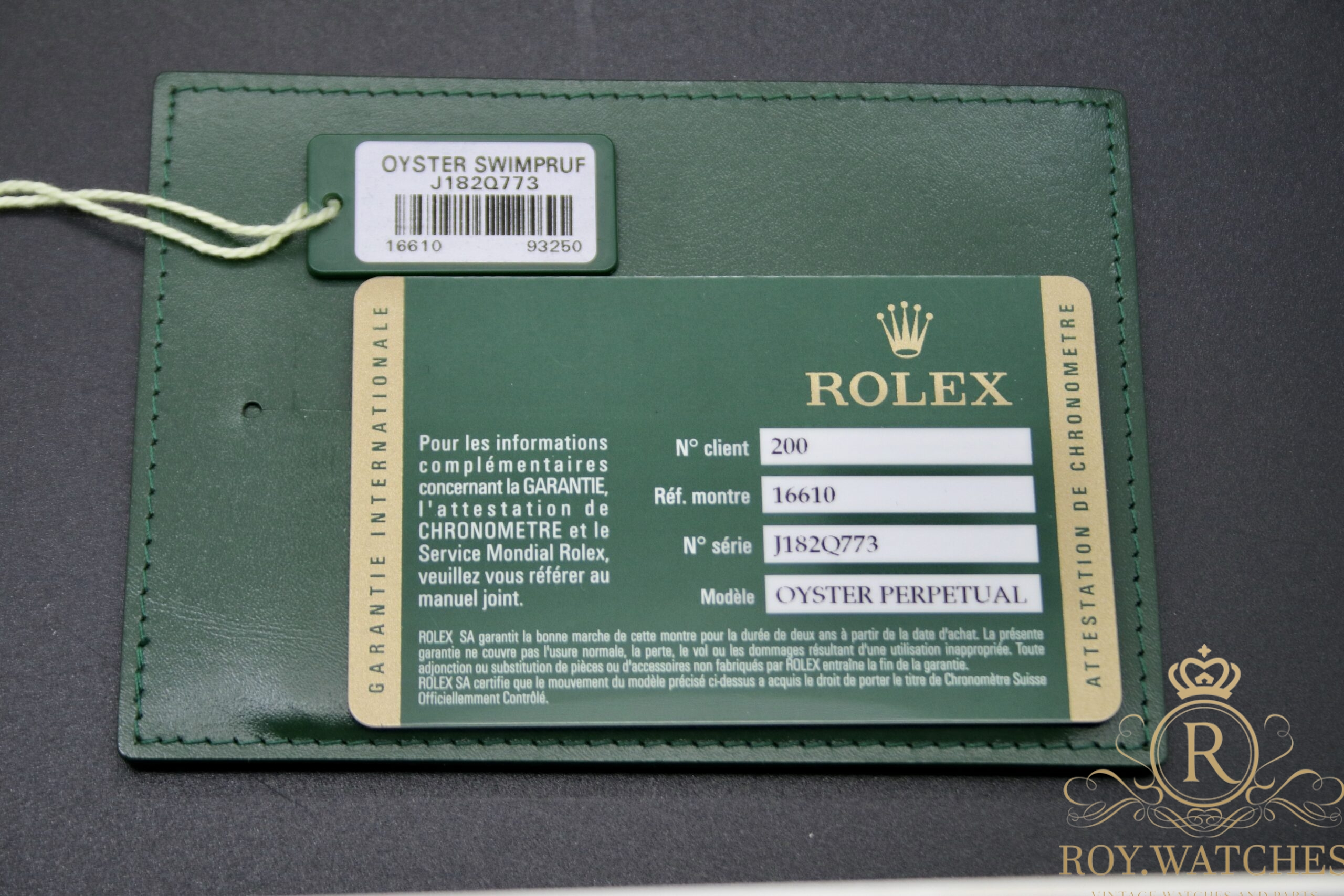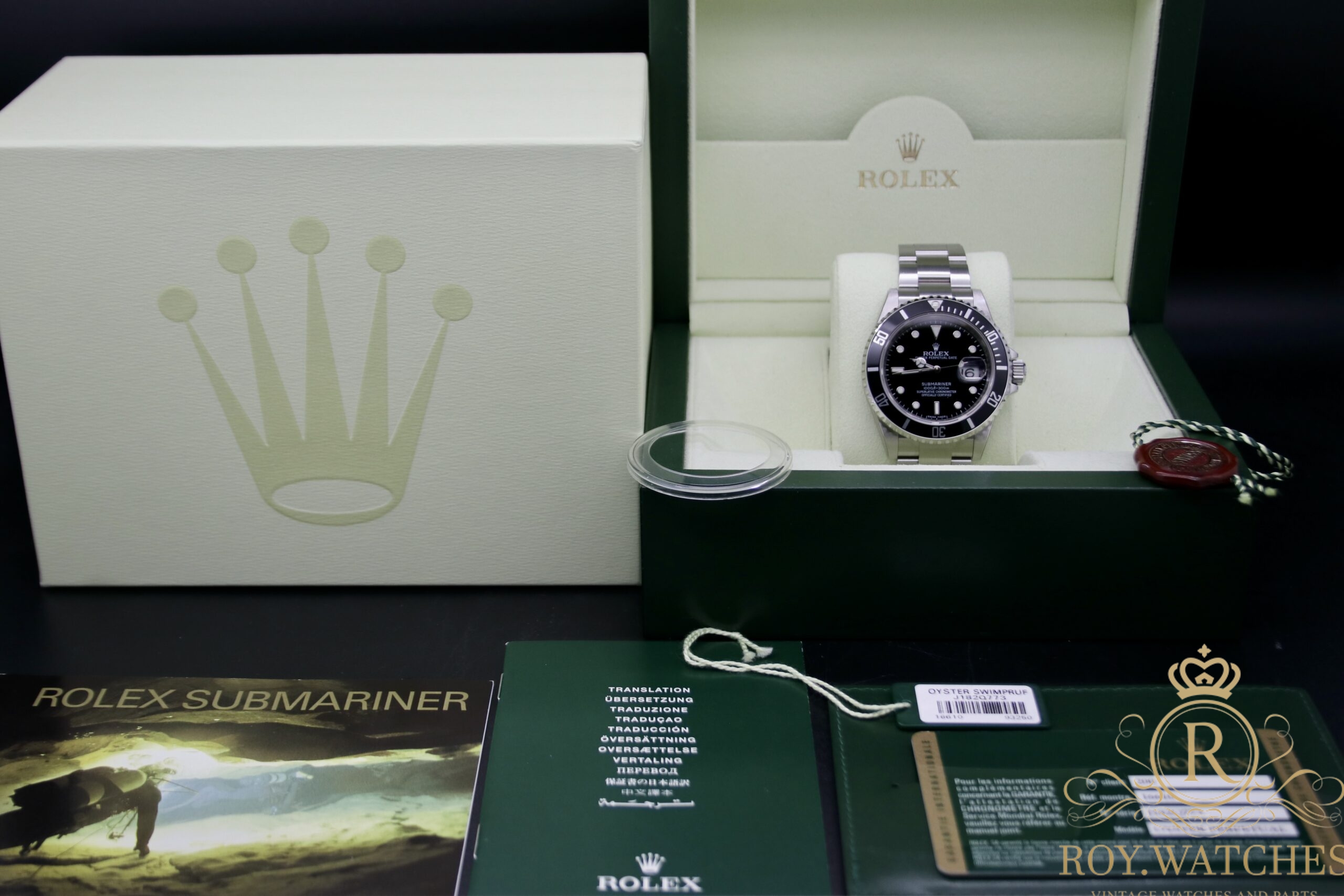 Full set from 2010 LC 200 – Greece Sold: 18.05.2010 Rolex Submariner booklet Rolex Oyster booklet Hang tag with serial number Chronometer hang tag Rolex boxset |